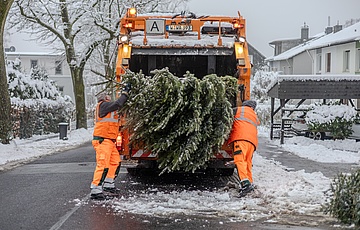 Während der aktuellen Weihnachtsbaumsammelaktion waren an fünf Tagen in der Woche täglich bis zu 8 Fahrer und bis zu 16 Lader mit Sperrmüll-Fahrzeugen im Einsatz. In einen dieser Wagen passen etwa neun Tonnen Weihnachtsbäume.