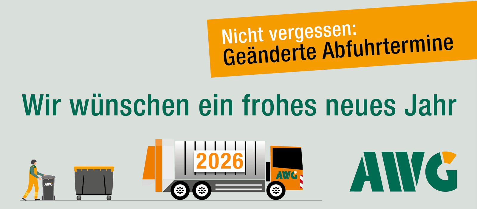 Wegen des Neujahrstags am Donnerstag, 01. Januar 2026, kommt die Müllabfuhr jeweils einen Tag später als gewohnt.